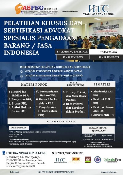 DPP ASPEG Indonesia Adalah oraganisasi Dewan pengurus Pusat Advokat Spesialis Pengadaan Barang Jasa Indonesia. Maka untuk mengefektifkan pengembangan SDM ASPEG Indonesia pentingnya para pengurus dan para anggota organiasi ASPEG Indonesia untuk mengenmbangkan potensinya khususnya dengan pelatihan Pengadaan Barang dan Jasa yang berbasis pada kompetensi. Hal ini sangat penting dalam mencapai tujuan organisasi ke depan agar memperoleh gelar non akademik secara mendiri dan mempunyai branding yang kuat dan berintegritas. Maka sebagai organisasi advokat yang memiliki kekhususan di bidang pengadaan barang dan jasa. Oleh karena itu, kami akan melaksanakan pelatihan untuk meningkatkan kompetensi dan kemampuan sumber daya manusia Internal ASPEG Indonesia. Atas dasar pelatihan ini tidak lain untuk kegiatan penunjang kegiatan sebagai pengakuan atas partisipasi dan keberhasilan untuk memperoleh sertifikat dan gelar Non akademik pada keterampilan/kompetensi yakni dalam hal ini dalam bidang spesialis lawyer di bidang pengadaan barang dan jasa. Pengakuan ini telah sesuai dengan UU No. 20 tahun 2003 tentang sistem pendidikan nasional, dimana pendidikan Non formal dan pelatihan berbasis dan pelatihan berbasisi kompetensi yang di akui sebagai bagian dari sistem pengembangan SDM. Maka, kami memastikan proses pelatihan akan dilakukan secara profesional kredibel dan sesuai dengan kurikulum kami yang berlaku di DPP ASPEG Indonesia.